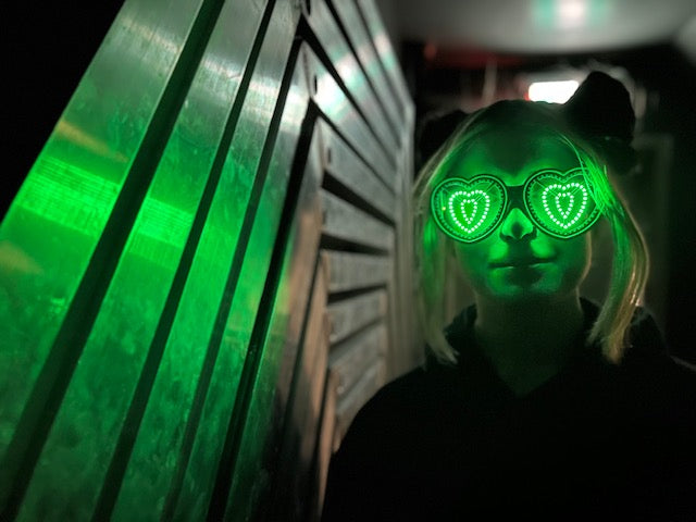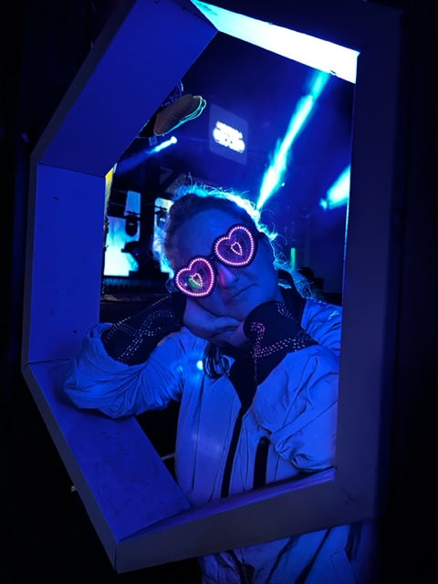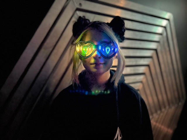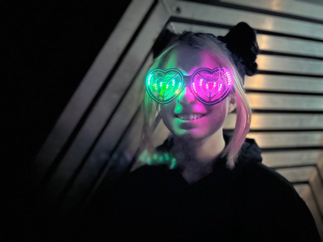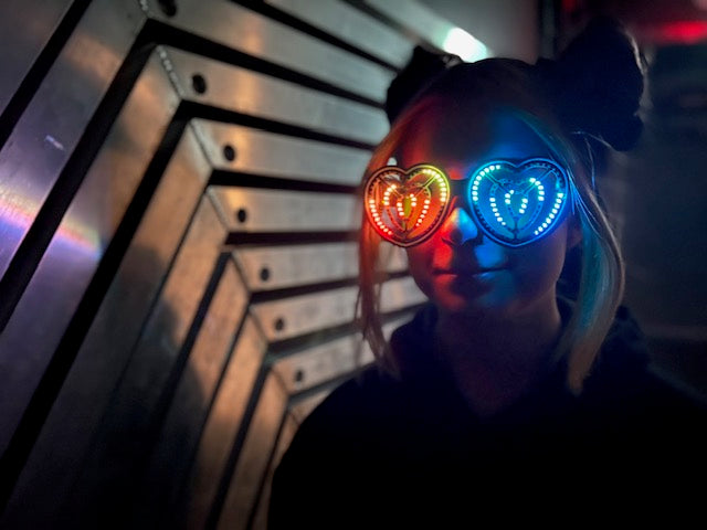 These heart shaped rave glasses are made to party! Our priority was a slim design with maximum visibility and LED count. These glasses are truely wireless with a built in 4+ hour battery(or much longer at lower brightness). For charging, the glasses connect to any USB port with our included magnetic cable on a 360 degree swivel so you can easily and comfortably wear them while plugged in if you need all day battery. The cable is 3feet/1m long, perfect length for hiding behind your ear and reaching a jacket pocket without having too much cable getting in the way. Every pair is designed and manufactured by us in Edmonton, Alberta, Canada. We are proud of our products, all customers new and old are always just 1 message away from speaking directly with us. Questions, problems or comments, we always like hearing from our customers and we will do all we can to make sure your glasses will run well for years to come.